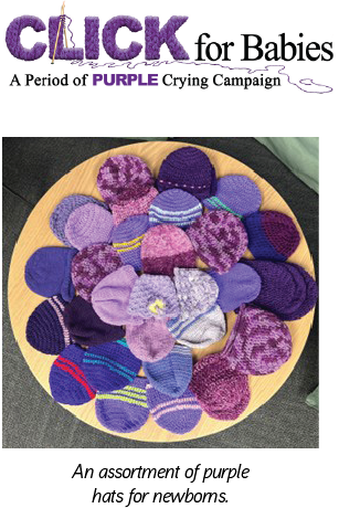 Handmade purple infant hats were knitted & crocheted by volunteers in support of our CLICK for Babies Campaign