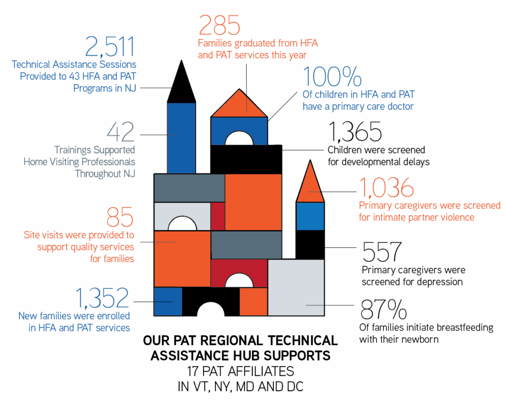 This national home visiting program builds strong communities, thriving families, and children who are healthy, safe, and ready to learn. Through individualized visits provided in family homes, families improve positive parenting practices, are more likely to detect possible developmental delays, and prevent child abuse and neglect. PCA-NJ supports PAT programs in 20 NJ counties and throughout Maryland, New York, Vermont, and Washington, DC.